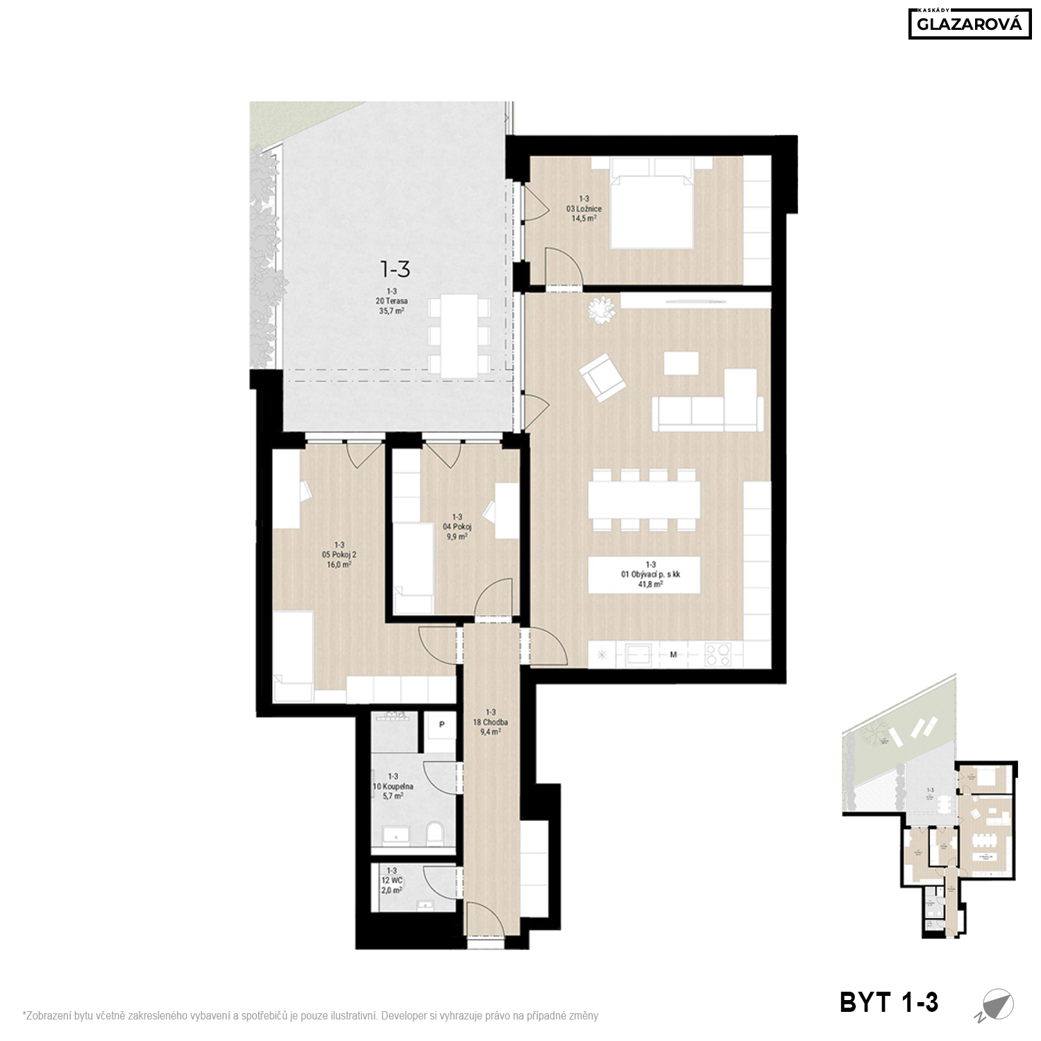 Zobrazený půdorys bytu, včetně zakresleného vybavení a spotřebičů, je pouze ilustrativní. Prodávající si vyhrazuje právo na případné změny.