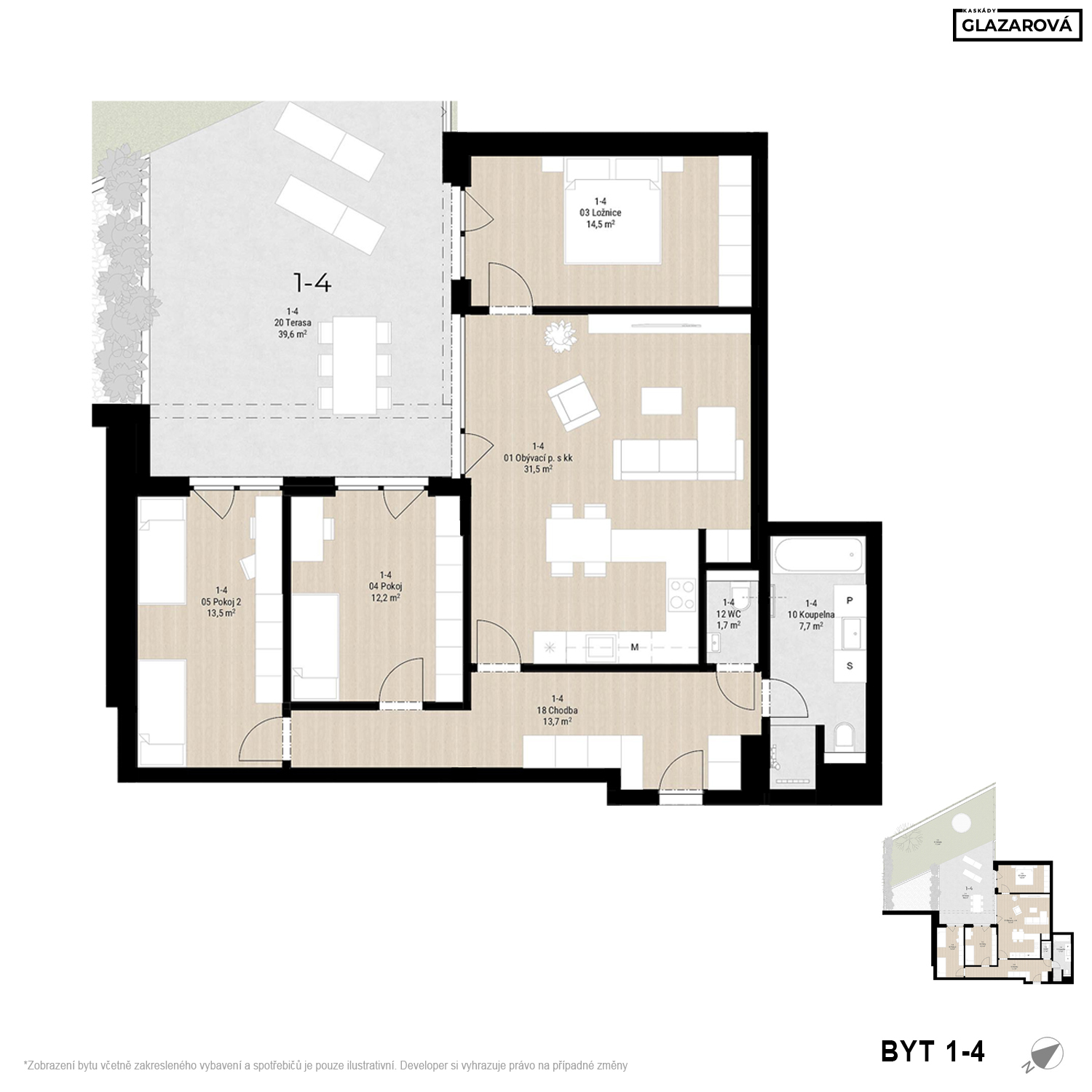 Zobrazený půdorys bytu, včetně zakresleného vybavení a spotřebičů, je pouze ilustrativní. Prodávající si vyhrazuje právo na případné změny.
