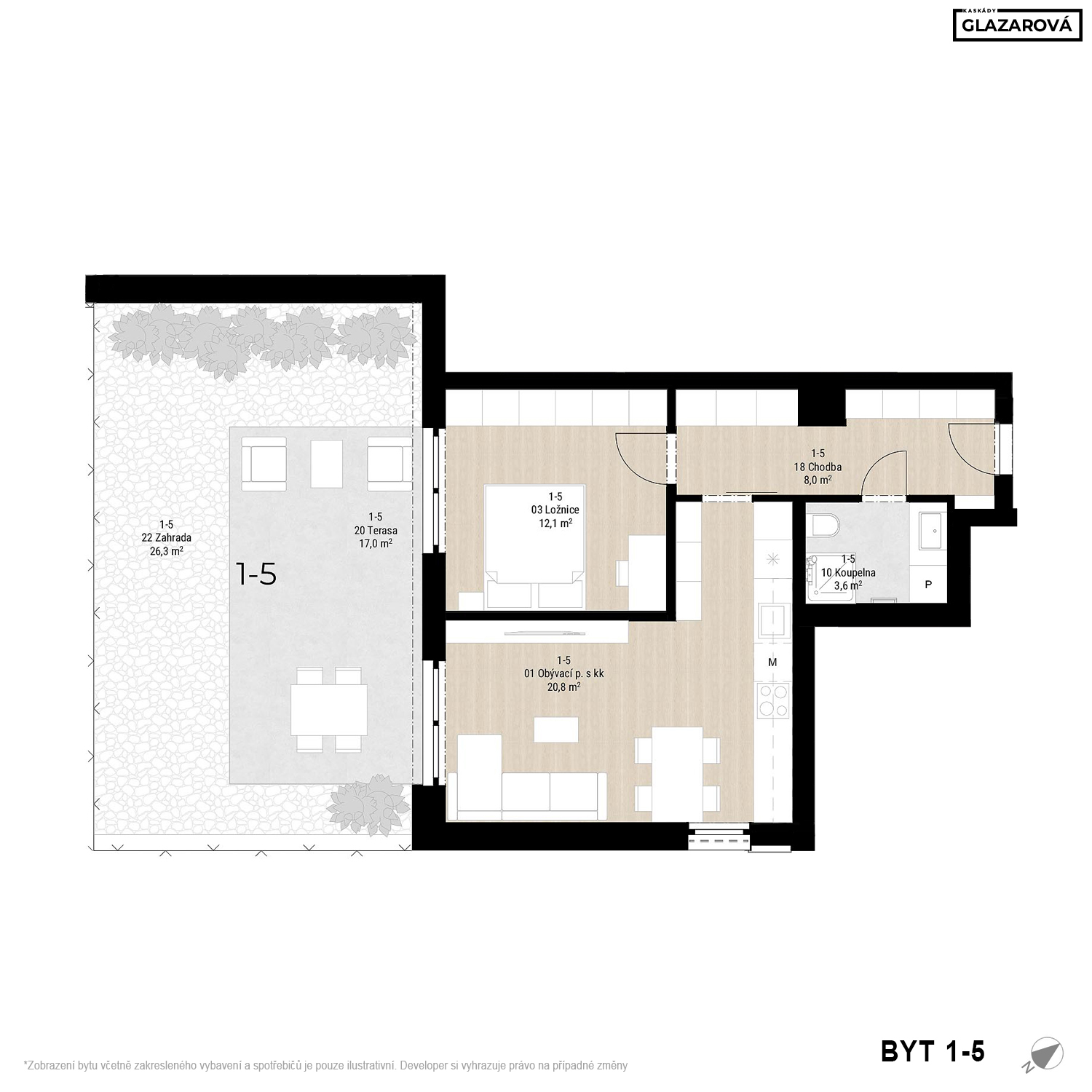 Zobrazený půdorys bytu, včetně zakresleného vybavení a spotřebičů, je pouze ilustrativní. Prodávající si vyhrazuje právo na případné změny.