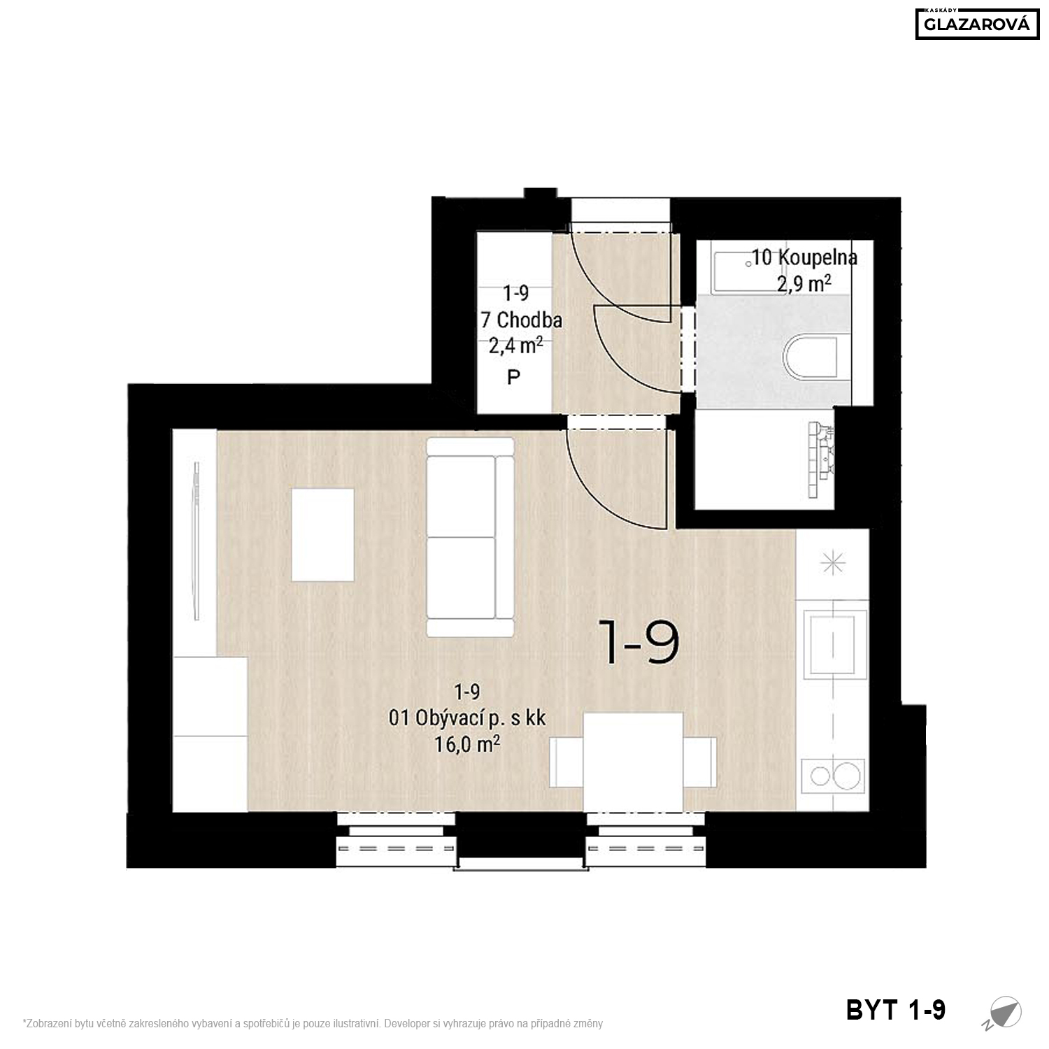 Zobrazený půdorys bytu, včetně zakresleného vybavení a spotřebičů, je pouze ilustrativní. Prodávající si vyhrazuje právo na případné změny.