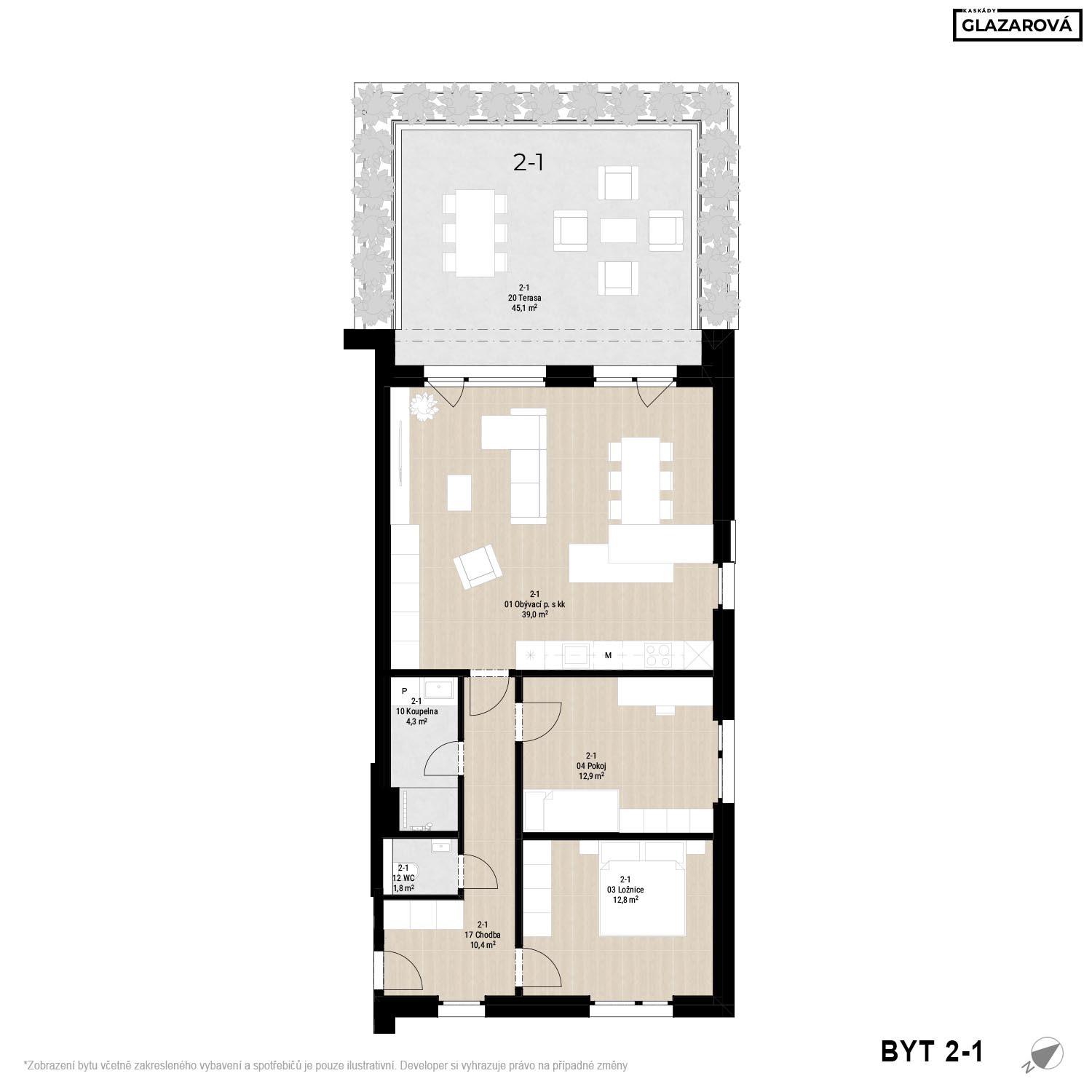 Zobrazený půdorys bytu, včetně zakresleného vybavení a spotřebičů, je pouze ilustrativní. Prodávající si vyhrazuje právo na případné změny.
