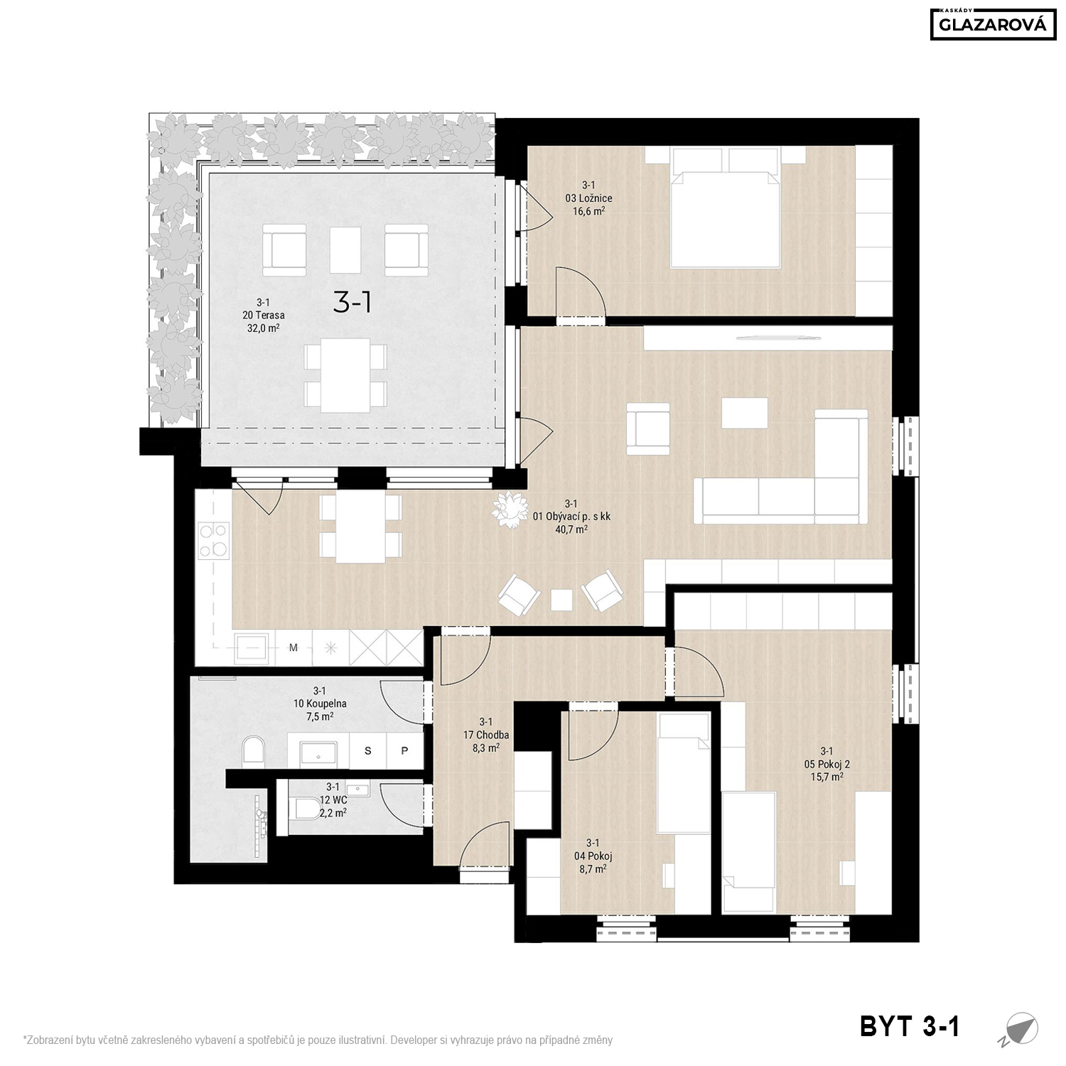 Zobrazený půdorys bytu, včetně zakresleného vybavení a spotřebičů, je pouze ilustrativní. Prodávající si vyhrazuje právo na případné změny.