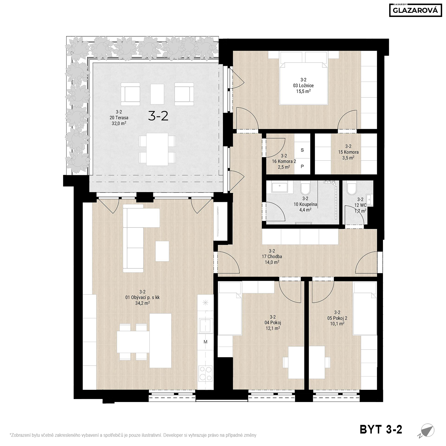 Zobrazený půdorys bytu, včetně zakresleného vybavení a spotřebičů, je pouze ilustrativní. Prodávající si vyhrazuje právo na případné změny.